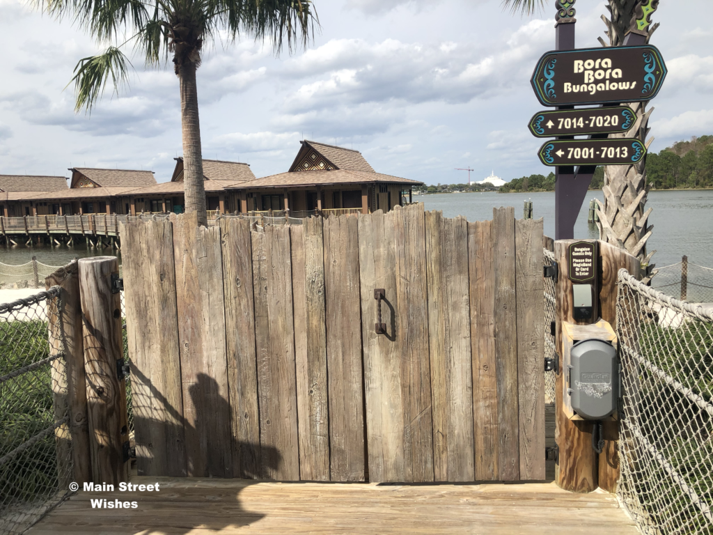 The gate is located at the entrance for the walkway to the Bungalows at Disney’s Polynesian Village Resort. You can kind of see the roping on the front porches of the bungalows in the picture above the gate. Guests must scan their MagicBands or cards to get into this area, which can be seen to the left in the bottom picture.