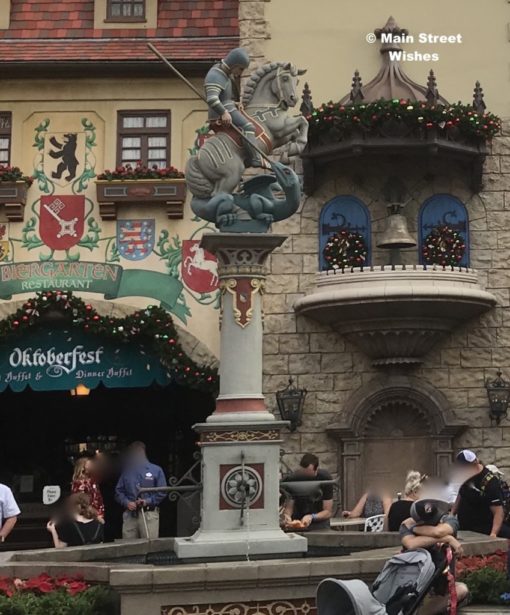 Congratulations to Dean, Steve, Doug, Dennis, and Lee who all knew that the fountain can be found in the Germany Pavilion at Epcot. The fountain is in the middle of the pavilion, so it’s one of the first things guests see as they approach the pavilion. On top of the fountain is St. George and the Dragon, which is inspired by the statue in the medieval Bavarian town of Rothenburg ob der Tauber (source: Wikipedia).