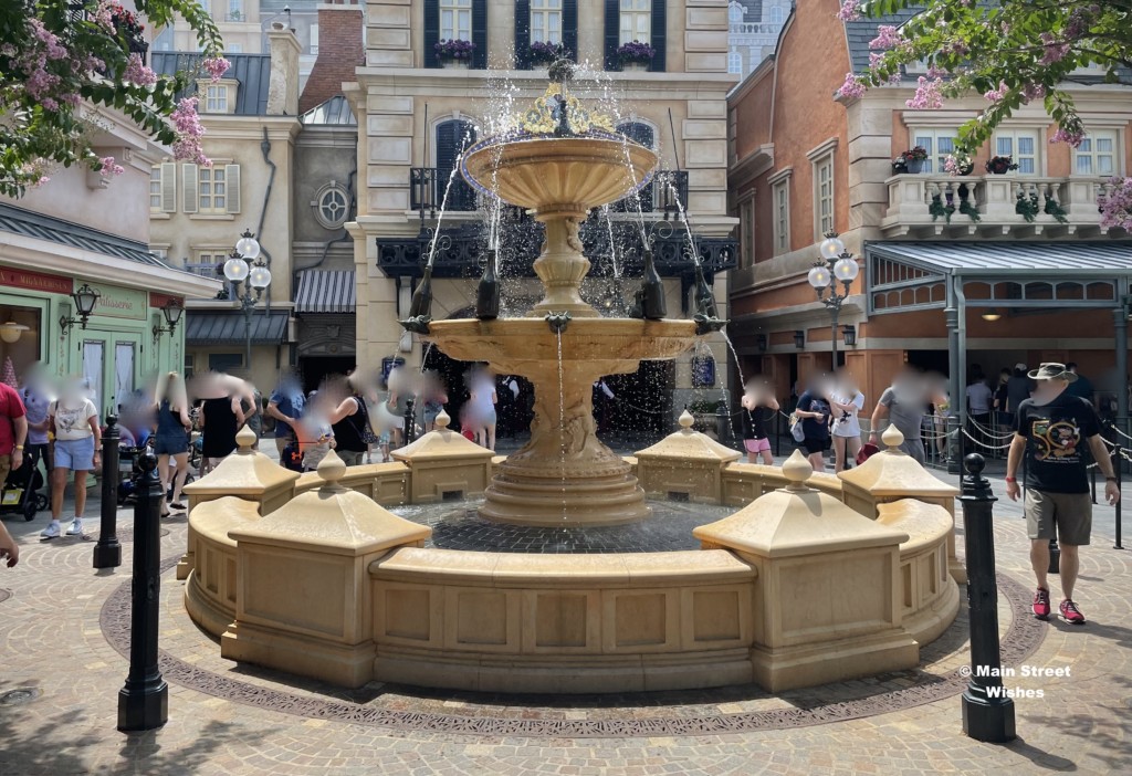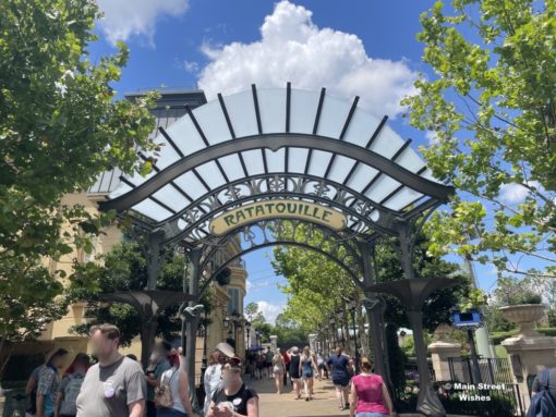 When guests first enter the area they’ll head down a path and under an arch that says Ratatouille. In middle of the area where the ride is located is a fountain that is themed to the ride. Guests will see Remy and friends pouring water out of bottles into the fountain. It’s actually a very nice fountain and it makes a nice background for pictures.