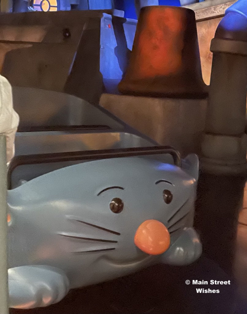 The ride itself is very cute. It’s one of Disney’s 4D rides, meaning guests wear 3D glasses, but there are other sensory effects added to the ride as well. Some of those effects are feeling heat under the stove and getting sprayed by an opened bottle of wine. Guests ride in vehicles that look like mice, with the idea being that guests are the size of a mouse, and they are following Remy through the kitchen at Gusteau’s restaurant. Of course, chaos ensues. There is a lot to see, so it’s really fun to look all around. Keep in mind that these ride vehicles do spin, nothing like the teacups, but they do spin around to see different scenes or change direction.