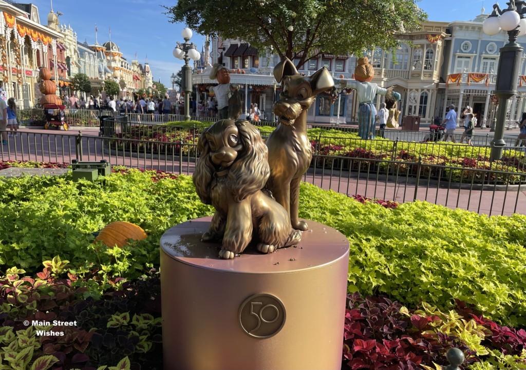 Also in this area is a waiting room for Tony’s Town Square Restaurant. The theme for the restaurant is Lady and the Tramp and features from the movie can be seen in the restaurant, starting with Tony’s face on the sign. One of the cutest features is the fountain that features Lady and the Tramp. If you’re waiting for a reservation, the porch is a good place to relax and people watch. Guests can make reservations for lunch or dinner, see the menus here. Lady and the Tramp are also part of the 50th Anniversary statues, which guests can see outside the restaurant.