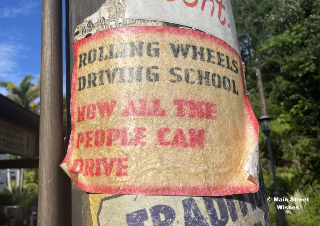 In addition to the bikes, there are also lots of posters and flyers to see. Disney has attached them to poles and the sides of buildings. These are some of the touches that are easy to miss, but the posters and flyers are located throughout the Africa and Asia sections. Animal Kingdom has some really great details in these areas, so it’s always interesting to take some time to just look around and find them.