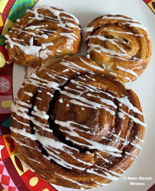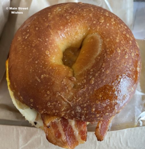 During our last trip we tried some of the items for breakfast: a bacon, egg, & cheese on a bagel, a NY half moon cookie, and a Mickey cinnamon roll. Everything was good, but as with anything, everyone has their own preferences for things. The NY half moon cookie was good and the chocolate cake portion of it was tasty, but I’m more of a fan of a black & white cookie where the cake portion is vanilla and a little more crumbly. The bacon, egg, & cheese on a bagel was decent and a good, quick option when you want to be able to eat something on the go. As for the Mickey cinnamon bun, that will always be a must when visiting this location. Plus, the cinnamon bun is big enough for a family to share. Those are only a small portion of what is available though. So it’s worth stopping by the deli when you are in the area to see what else they have.