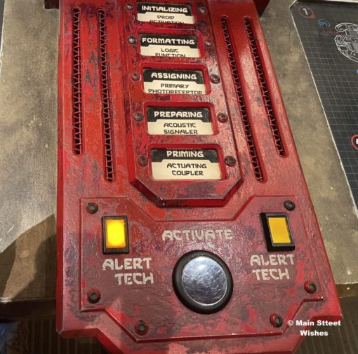 Once at the building area a cast member will guide you in building your droid. If there are any issues putting the droid together, the cast member will help. After the droid is build the next step is to activate it. The cast member takes the droid and puts it in a space at the top of the build area and when you are ready you press the “Activate” button. Once the button has been pressed you will see your droid start to move and make noise, and the lights on the build area will light up, indicating that the droid is ready and can be taken home.