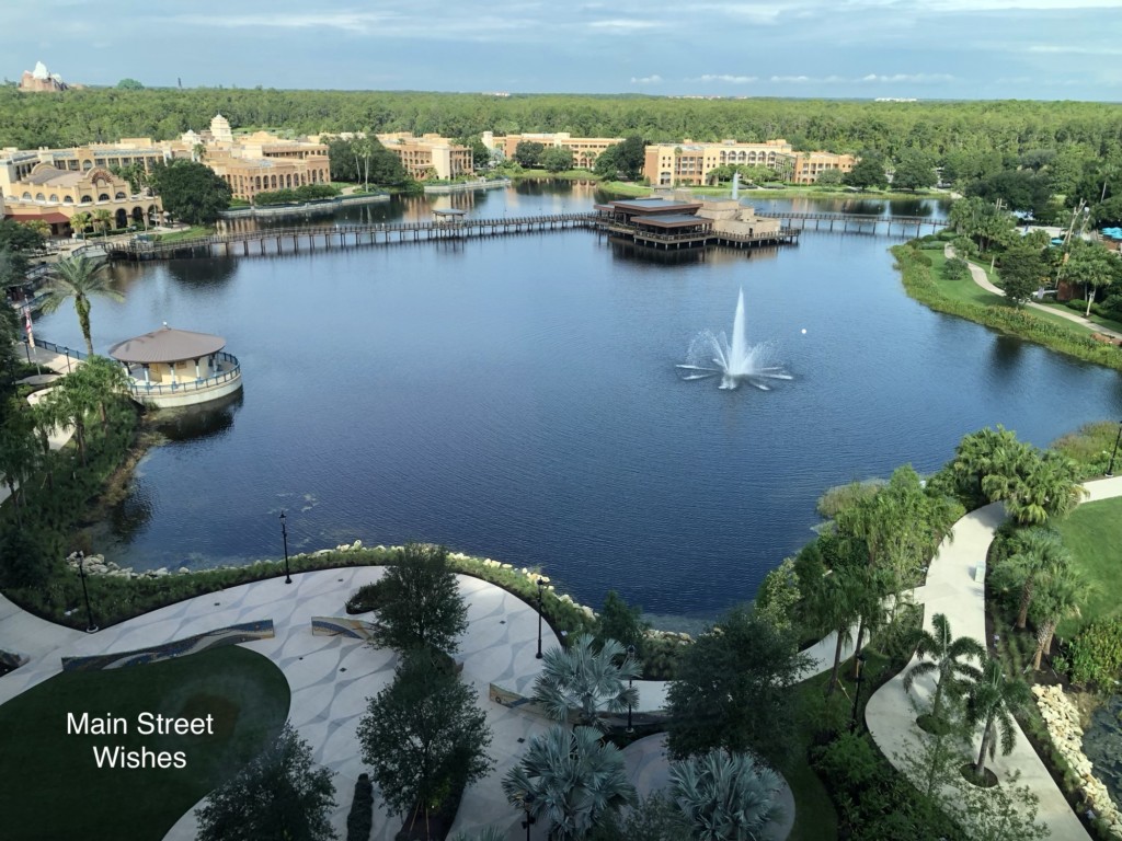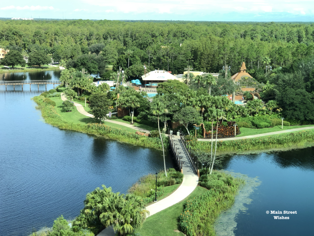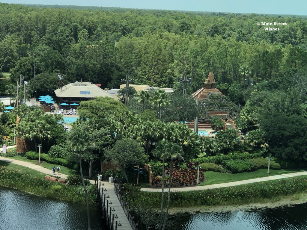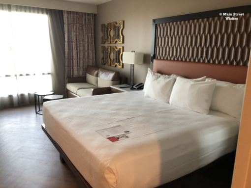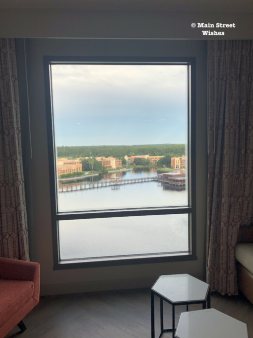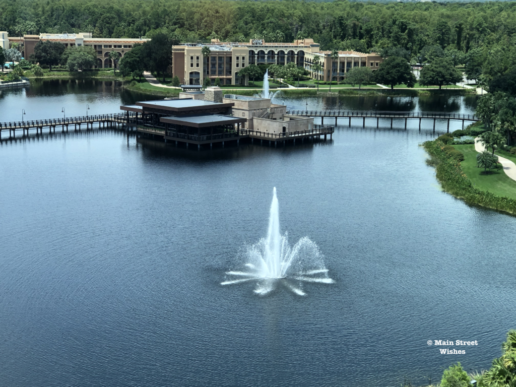 During my stay here I was in a water view room with a king bed. I have to say I was really impressed with the view! The windows in these rooms are huge and give a great look at the resort as well as Animal Kingdom! Looking in the distance you can see Expedition Everest from the resort, which was pretty cool. You Three Bridges Bar & Grill in the middle of the lagoon. If you want this view, I would recommend requesting a water view room and a higher floor room when you do online check-in.