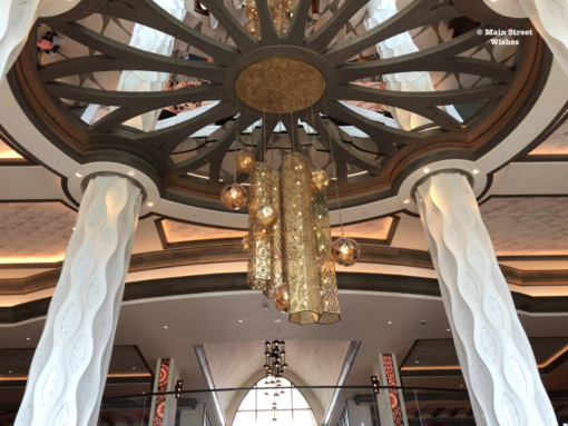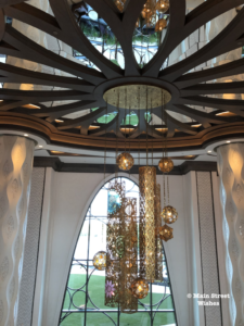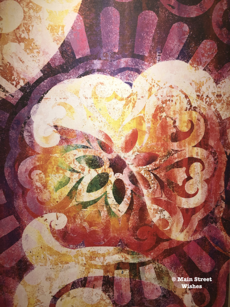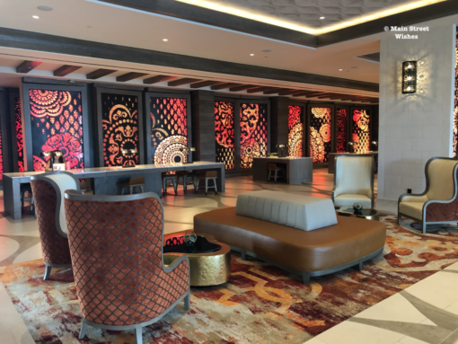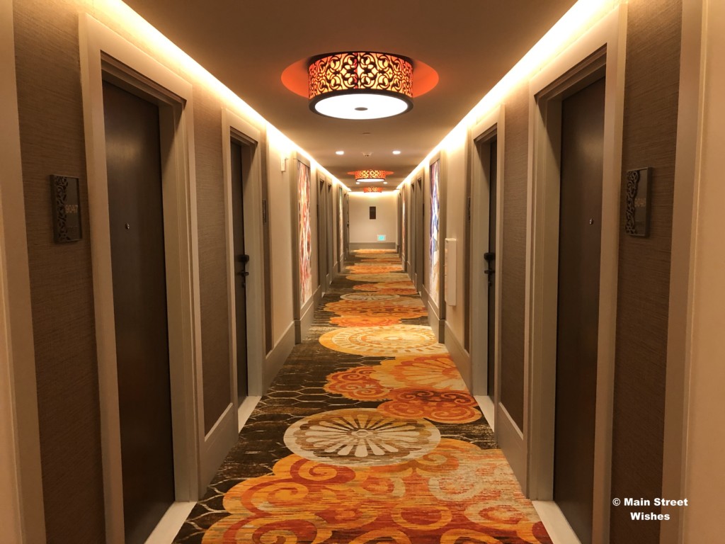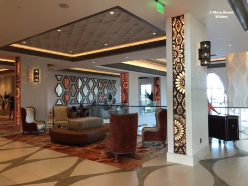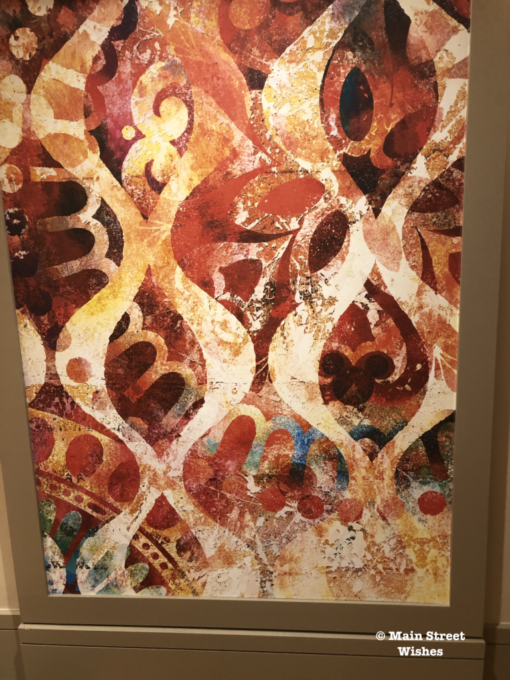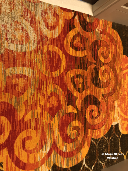 I really love the decor at this hotel. The tower itself is a beautiful design and it lights up at night, which gives it a dramatic look. The huge arches at the entrance really make you feel that you have arrived somewhere grand. I also loved the colors in the artwork, the walls, and the carpets. They used a lot of deep colors, which gives the hotel very classic, dramatic look and I love it. Make sure to look for Hidden Mickeys in some of the designs!