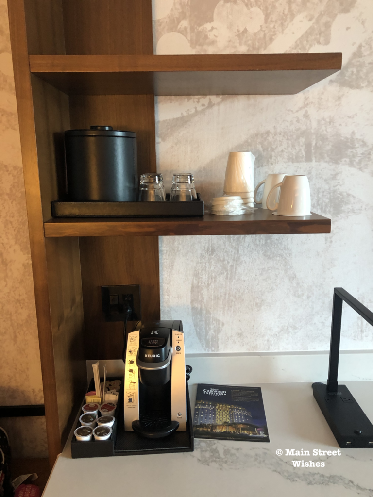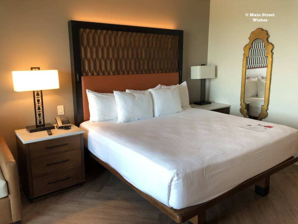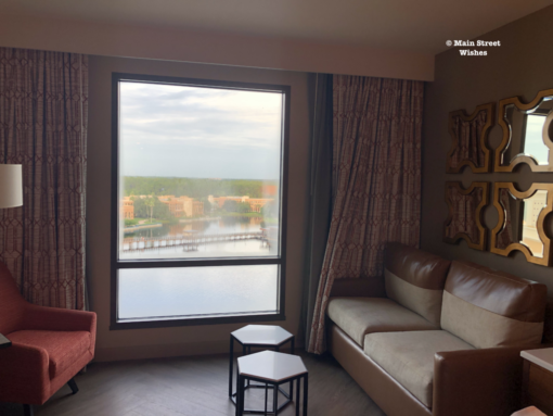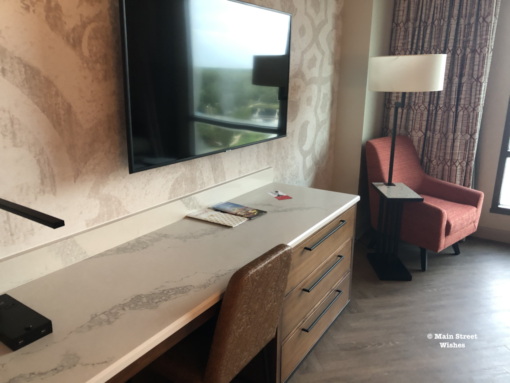 The room itself was really nice. It has all the same things that a standard studio has, like a coffee/tea area, USB ports for charging (in addition to regular plug outlets), a desk area with the tv mounted above it, a sitting area, a vanity outside the bathroom, a dresser, a safe, and a refrigerator. I was in a king room, so there was a couch in addition to the chair and table. The bathroom/vanity area can be closed off with a barn style door that slides. Something else I noticed is that there are little lights that flip up on each side of the headboard. Also, following most of the recent renovations at other Disney hotels, there is no carpet in the room.