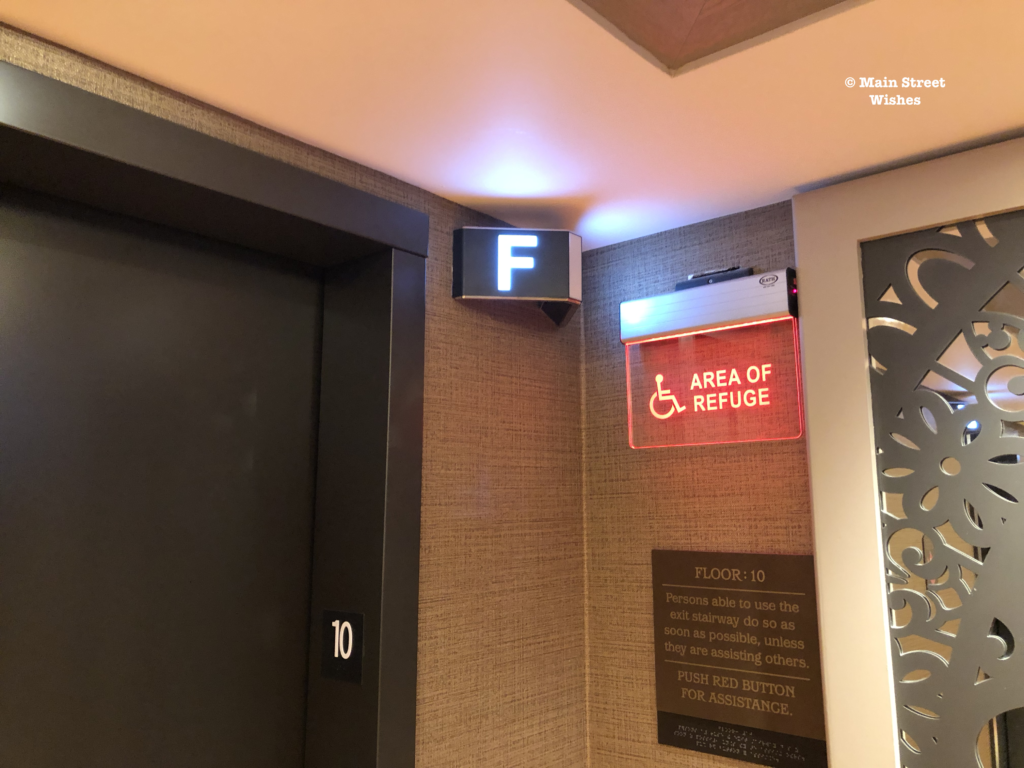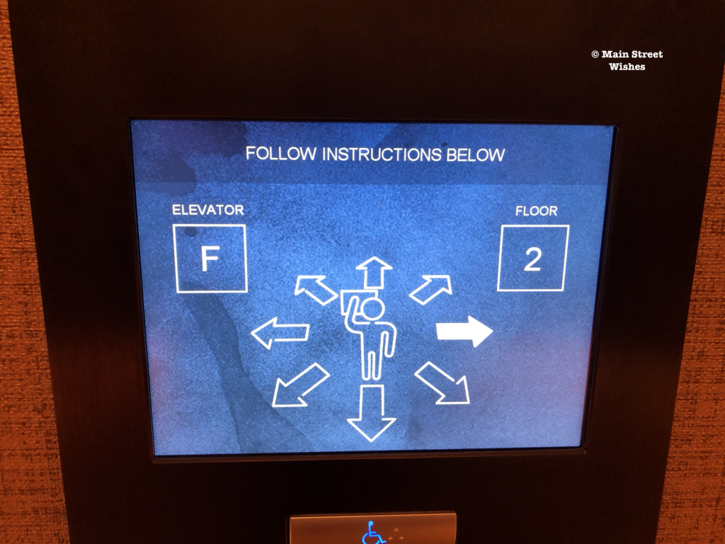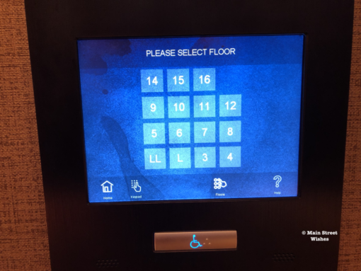 Once you make your way past the sitting areas you will come to the elevators. There are a good amount of them, which helps for those returning after the parks have closed. The elevators have a digital pad where you pick your floor. It can be confusing if you haven’t been here and dealt with it, so I’ll explain. The elevators all have letters above them, when you pick your floor you will be given the letter of the elevator that will take you to your floor. Don’t let the arrows on the screen confuse you, just look for the letter on the screen and you’re good.