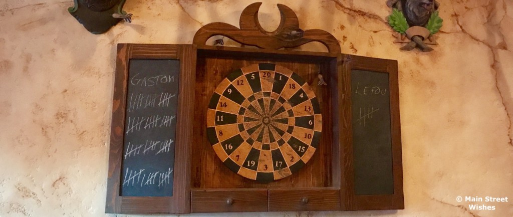 One of my favorite decorations at Gaston’s Tavern is the dartboard in the other dining area. It’s hanging on the wall and it shows that Gaston and LeFou have been playing quite a few games. Of course, poor LeFou has only won five games compared to the sixty games won by Gaston.