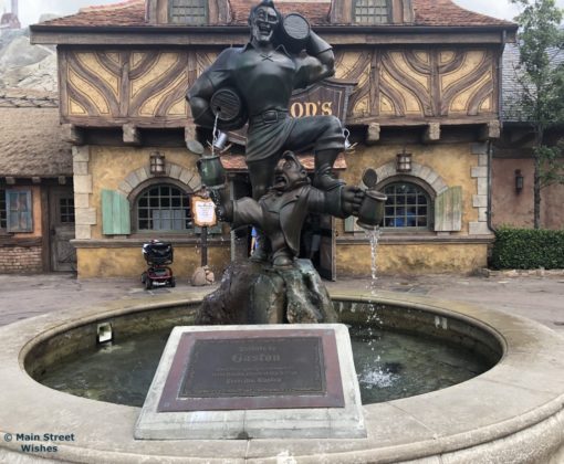 Outside the tavern you will find a fountain inspired by the one in the animated movie. The fountain shows Gaston standing tall with one foot on a rock and one foot on LeFou’s shoulder. Gaston is holding a barrel that is spilling and Lefou is trying to catch the spilling liquid in his cup. The fountain is a fun photo opportunity by itself or as a background to take a picture in front of.