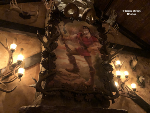 Once you step inside the tavern there is no mistaking where it gets its name. The chair, which is actually Gaston’s chair, is located in the dining room with the fireplace. Above the fireplace is a gigantic picture of Gaston on top of a mountain looking very proud of himself. The frame of the picture is outline with different sets of antlers and there are light fixtures made out of antlers, as well. These decorations are pretty similar to what the tavern looked like in the animated feature, just take a look at this picture.