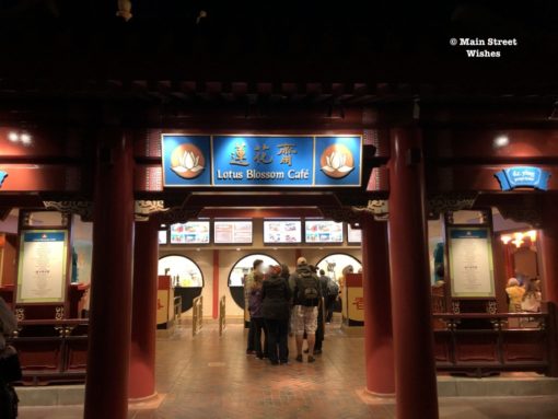 The flower is located at the Lotus Blossom Cafe in EPCOT. Specifically, this restaurant is located in the China pavilion in the World Showcase. This quick service location does a good job getting the food out quickly, which is helpful when you’re taking the food to go to get a spot for fireworks. They have a decent menu to choose from, and it’s a good backup if you can’t get into one of the table service restaurants or if you don’t have time for a table service meal.