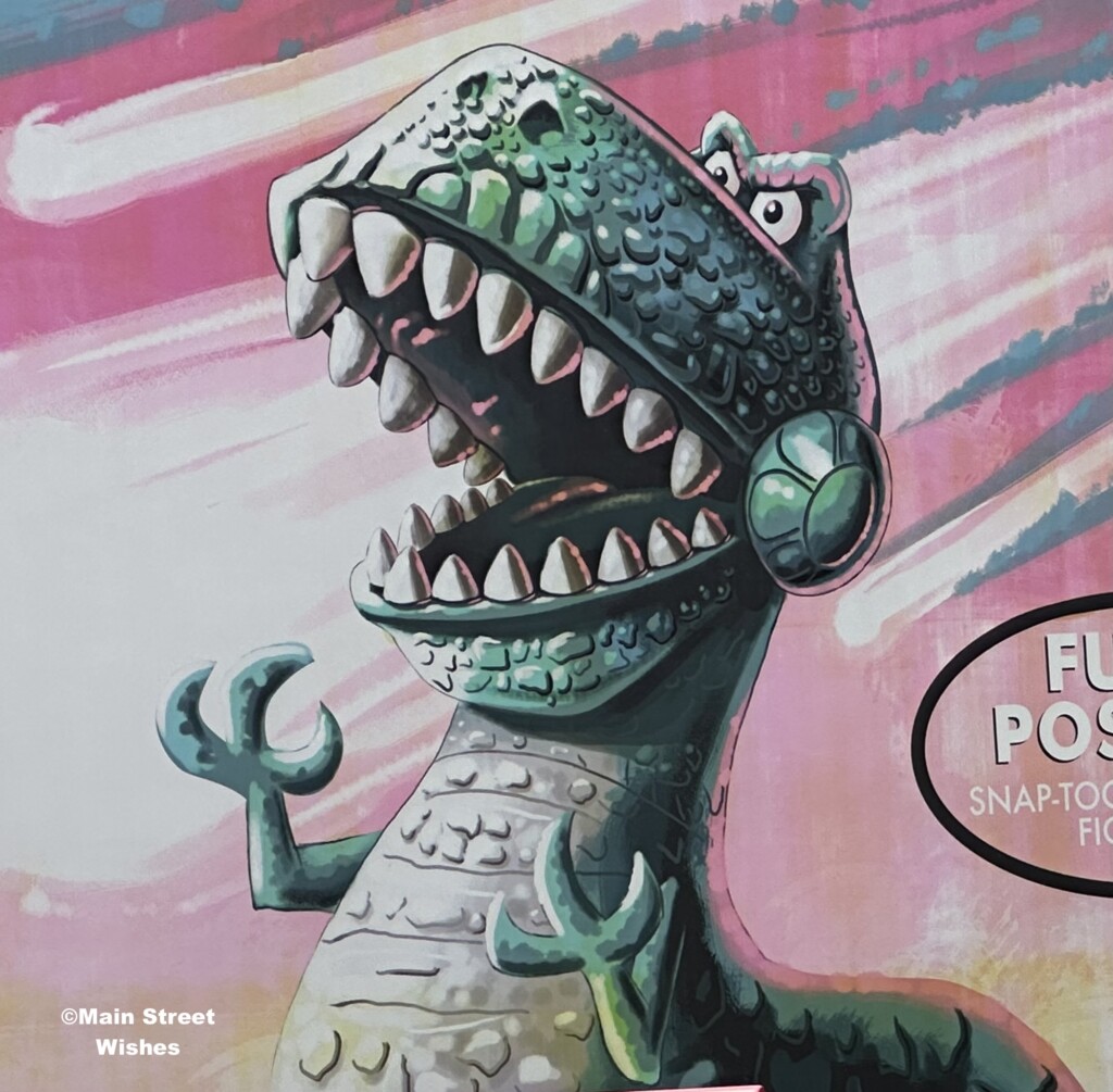 Congratulations to Winnie, Melanie, and Penny, who all knew the Rex is located on Slinky Dog Dash. Guests can see the wall with Rex from the queue line and they’ll get an up close look once on the ride, since it’s the first thing outside of the queue area that the ride vehicles pass. Slinky Dog Dash is located in Toy Story Land at Hollywood Studios, and is one of Disney’s most popular rides. This fun outdoor roller coaster is supposed to be a new toy that Andy set up in his backyard and guests can see some of the toys helping to hold up the lights over the ride (including Rex). On the ride there are some good views of Toy Story Land and there are fun details to see. Check out Disney’s POV video of the ride to see some of those details pointed out (including the wall with Rex).