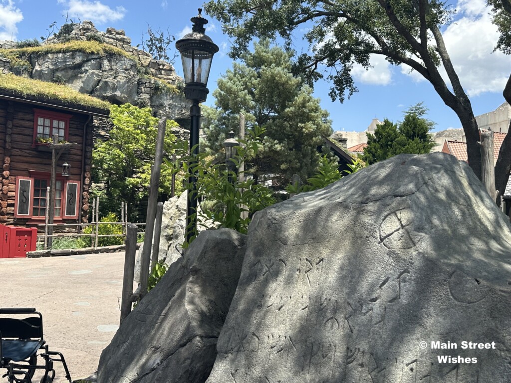 The markings can be found on a rock in the Norway pavilion. It’s in the center area by the walkway, and when you are looking at it from this direction the Anna and Elsa meet and greet will be on your left. I’ll be honest, I’ve been to EPCOT too many times to count and I’ve only recently noticed these markings, so this is definitely one of those easy to miss Disney things (at least it was for me).