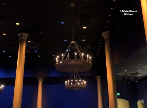 The area in the picture is located in Micky’s PhilharMagic. It’s the area where guests wait to go into the theater. The high ceilings, big chandeliers, and color scheme in this area fit will with the rest of the Mickey’s PhilharMagic decor. There’s plenty of space in this area to for guests to wait by the theater doors. Once the doors open guest can enter the theater and choose a row. Guests are told to walk to the end of the row, not to stop in the middle of the row, to fill in all the seats, which is especially important when it’s busy. If you want to sit in the middle of the row, then let other people go in the row before you, that way you won’t be all the way at the end.