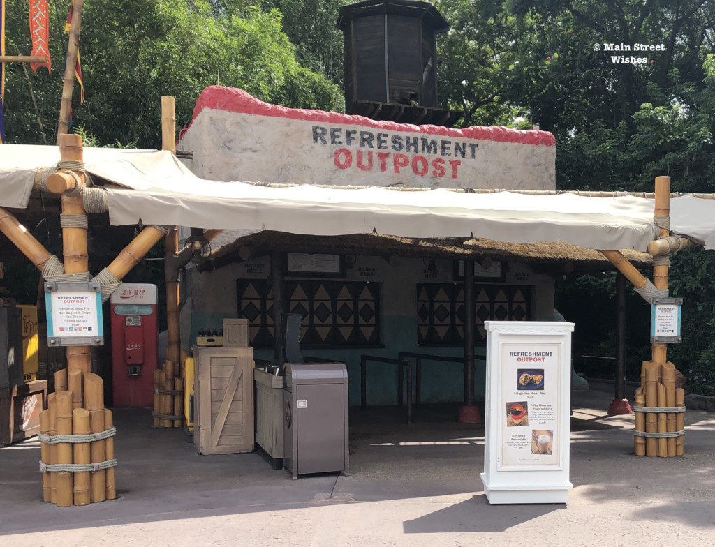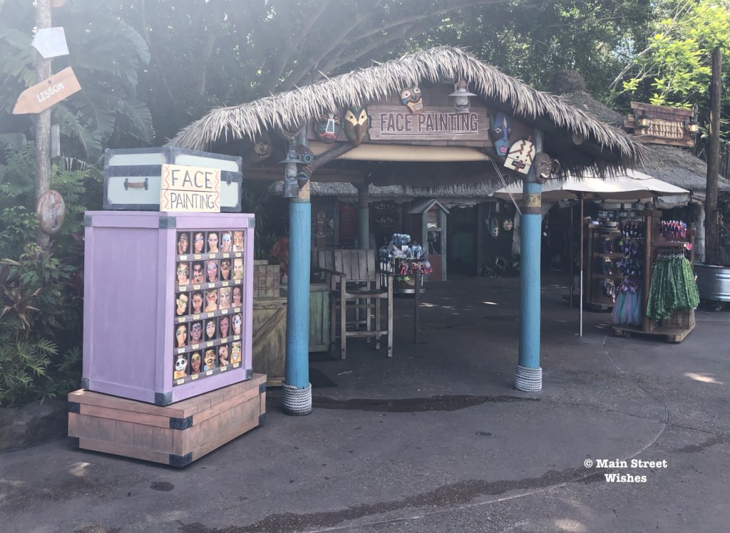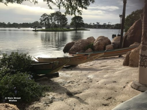 It’s not a huge area, but it’s worth a look around. The drum area is a popular stop and there’s an old looking car parked right near the area, which is a fun backdrop for pictures. Across the way you will see some tables where you can sit and enjoy snacks and drinks while having a nice view of World Showcase Lagoon. Looking over the barrier by the tables you will see some canoes on the beach, a nice detail that’s easy to miss.