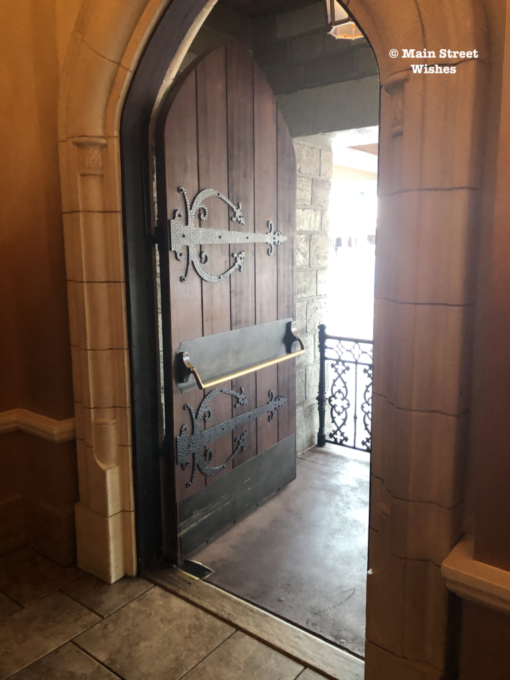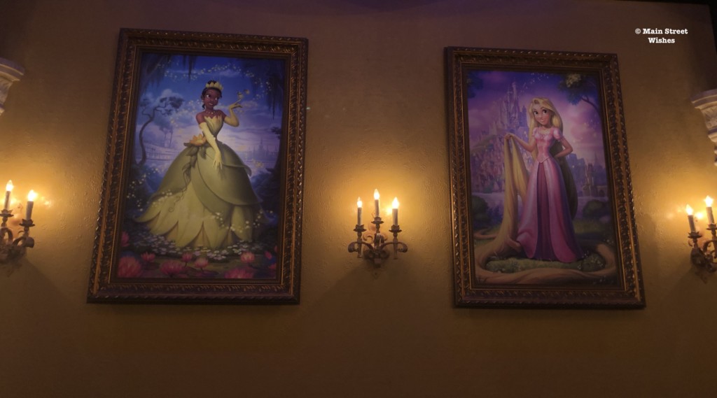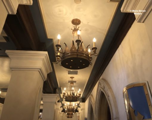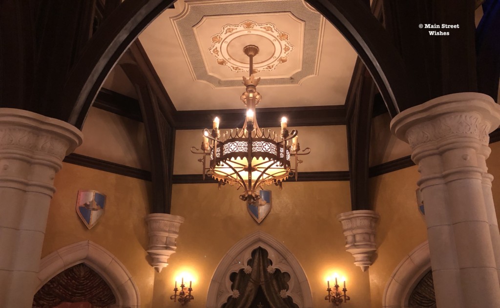 There are so many fun touches inside the building, in addition to the window. The doors at the entrance look like big heavy doors you would fun at a royal palace, the chandeliers lining the ceiling look like crowns, there are banners hung around the room, pictures of the princesses are hung high on the walls, and Cinderella’s glass slipper can even be seen here. It’s a fun area to look around and take some pictures while you wait to meet the princesses.