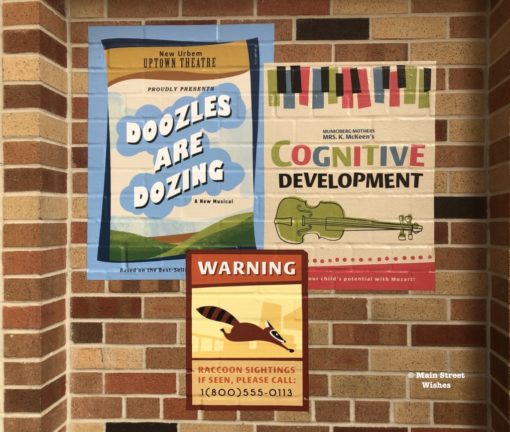 The posters are located near the end of the area. There may not be a lot going on in Pixar Place, but there are still lots of fun details to see. There are other posters, business names from the movies that are above doors, and clues that Jack Jack has been in the area. It’s fun to take a little time and wander the area looking at the details.