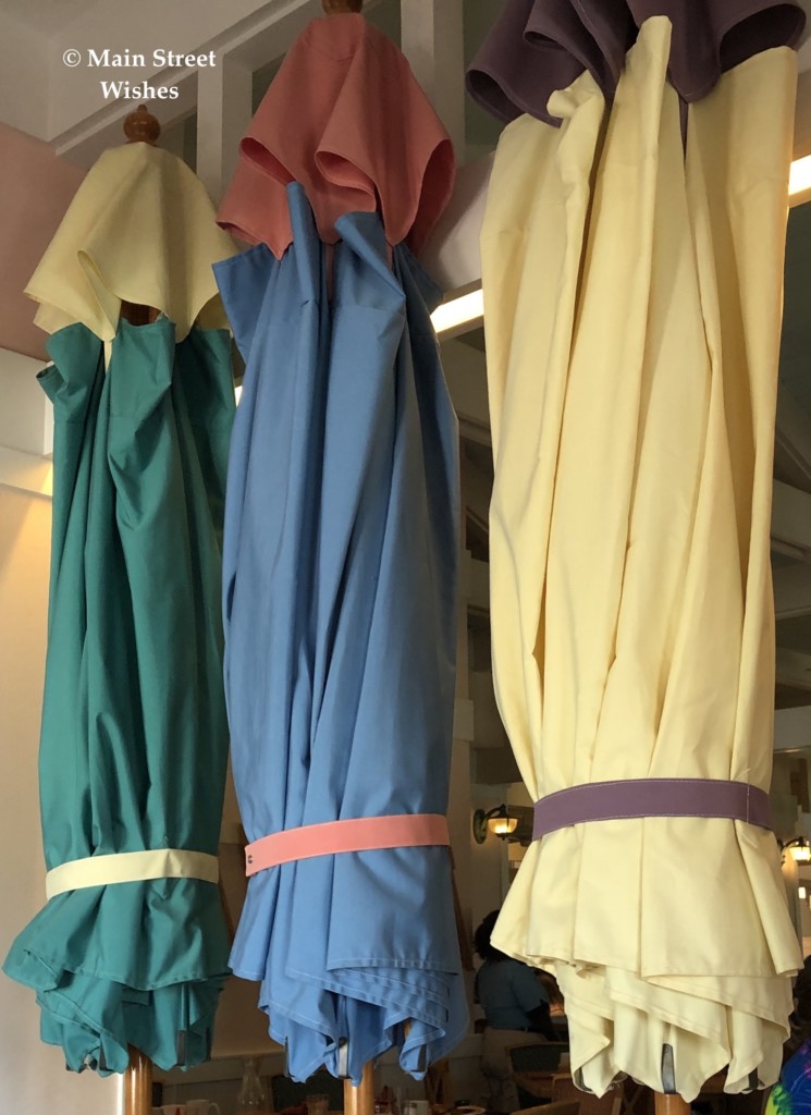 You can find the umbrellas surrounding Cape May Cafe, the character dining experience at Disney’s Beach Club Resort. Up until the shutdown, this restaurant was an all-you-care-to-enjoy buffet with characters who stopped by your table. Guests could get pictures with Minnie, Donald, Daisy, and Goofy all dressed in their beach gear. The characters also signed autographs when they stopped by the tables. Things will be different when the restaurant reopens, but hopefully the characters will still parade through the dining room so guests can see them from a distance (like they are doing at Topolino’s Terrace).
