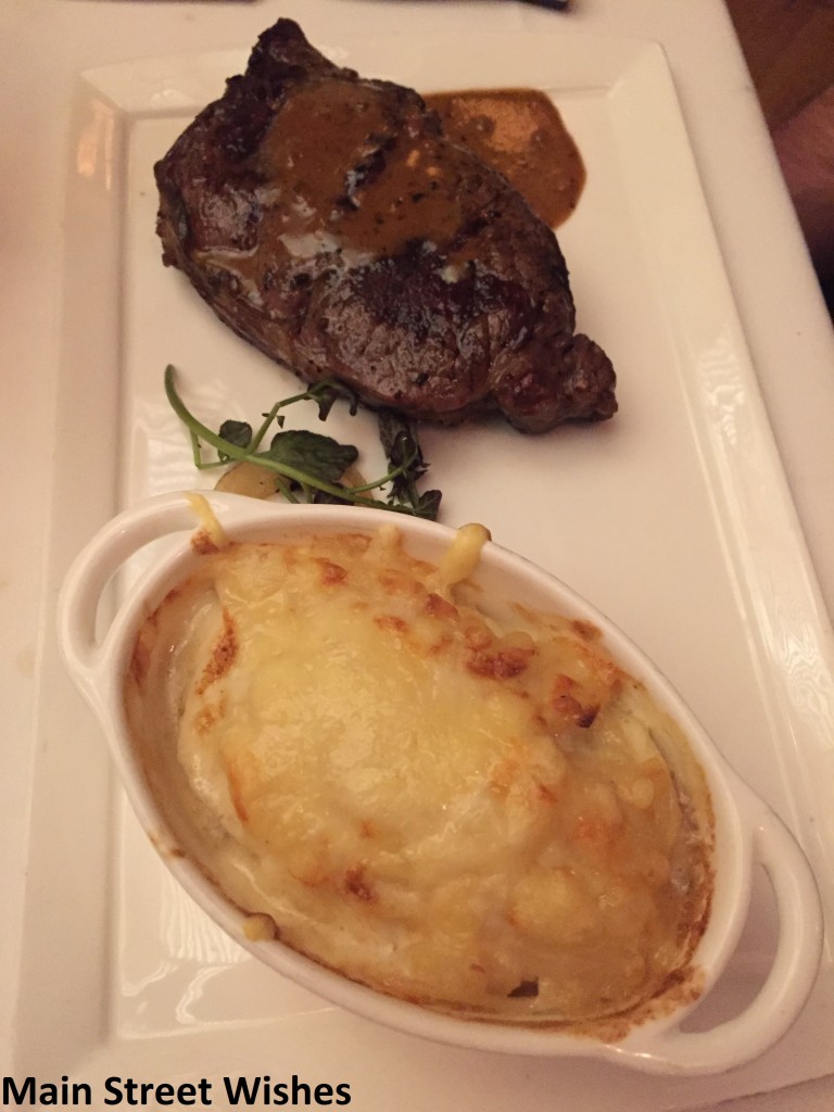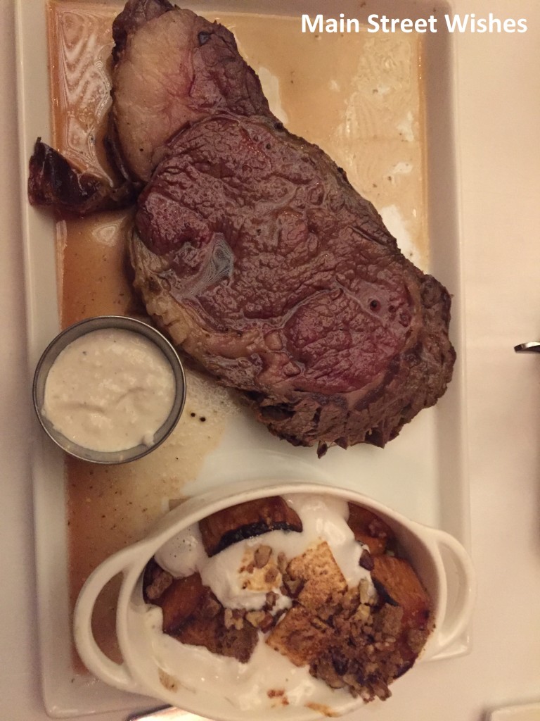 For the main dishes my husband got the 12 oz. Prime New York Strip Steak and I got the 14 oz. Roast Prime Rib of Beef. My husband’s dish came with Potatoes Gratin and had a Peppercorn-Brandy sauce. He was very pleased with his choice. The knife cut through the steak with little to no effort and the potatoes were cheesy and delicious. The potatoes came in a separate dish, which was nice because the flavors of the potatoes and the steak are kept separate. The cost of this meal was $49.