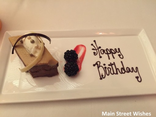 My husband was not going to get dessert, but Raymond wouldn’t hear of it. He brought him out a special “Happy Birthday” dessert. Every time he walked past our table after that he would wink and say “Happy Birthday!” He really wanted my husband to have a dessert and we thought the way he did it was both funny and thoughtful. The dessert was a mousse topped with some shaved chocolate and had berries and “Happy Birthday” written in chocolate on the side. It was really good and my husband ate it all (minus the piece I tried).