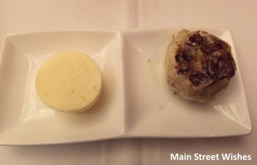 Raymond brought a basket of bread to the table with butter and garlic. There were two types of bread. One was onion bread with pieces of onion in the bread and the other was a dinner roll. The butter and garlic come on their own plate, because you get a very generous portion of each. The garlic is actually a whole roasted garlic. So you can pat the bread on top or take the garlic cloves out to put on the bread. Both types of bread were delicious!