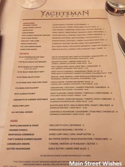 Our entire experience at the Yachtsman Steakhouse was fantastic. The food was delicious, the ambiance was nice and relaxing (the surprise view of fireworks didn’t hurt either), and the service was one of the best we have received on Disney property. I would recommend this restaurant to anyone, especially if they like a really good steak. If you do make reservations for the Yachtsman, ask for Raymond. He’ll take good care of you.