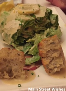We looked over the menu and finally decided on our appetizers and main dishes. My husband got the Caesar Salad, which turned out to be a really good size appetizer. It was a small whole heart of romaine with the end cut off. The dressing was drizzled on top and throughout the lettuce; there were some good sized croutons, shaved Parmagiano cheese, all on top of coppa ham. It was very good and well worth the $12.