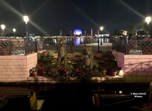 During the Flower & Garden Festival there are topiaries placed all throughout Epcot, with most being placed around the World Showcase. While walking between Italy and the American Adventure I spotted this display. I loved the placement of the Lady and the Tramp topiaries. It’s especially nice at night with Spaceship Earth lit up behind them. If the parks open before the festival is over, I recommending heading to this topiary for a picture.
